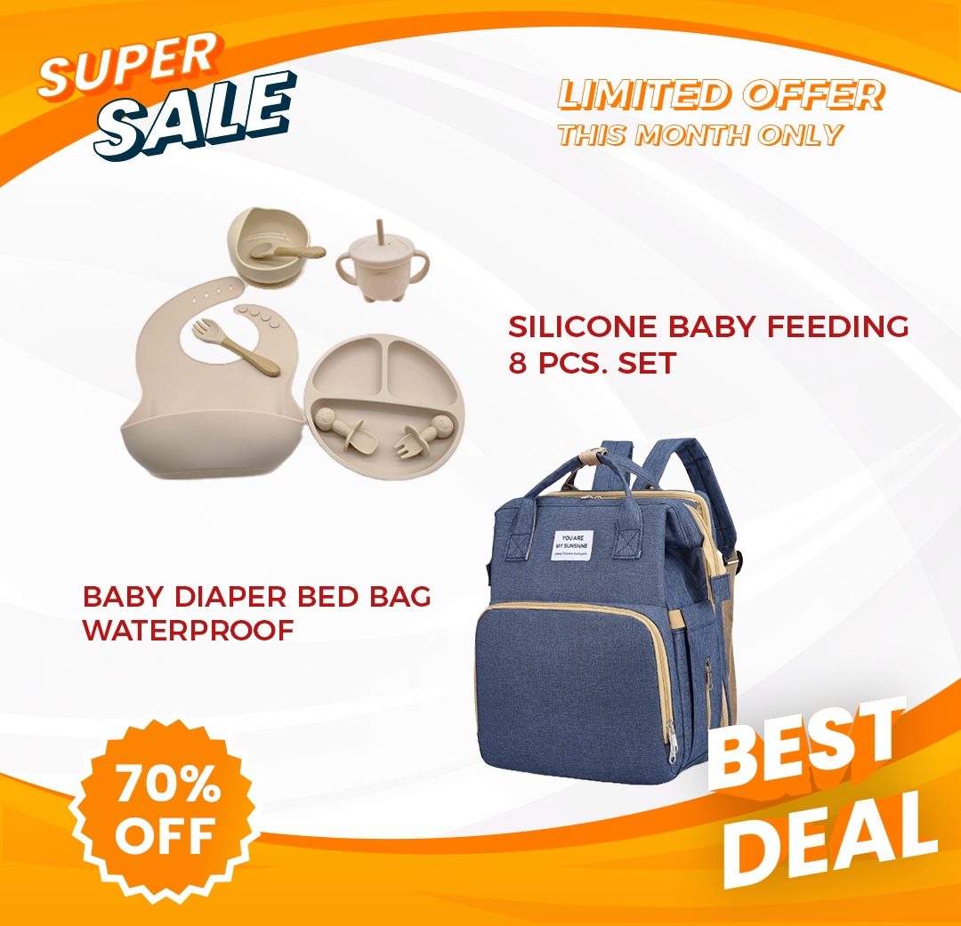 Baby Diaper Bed Bag Waterproof + Silicone Baby Feeding Set 8pcs